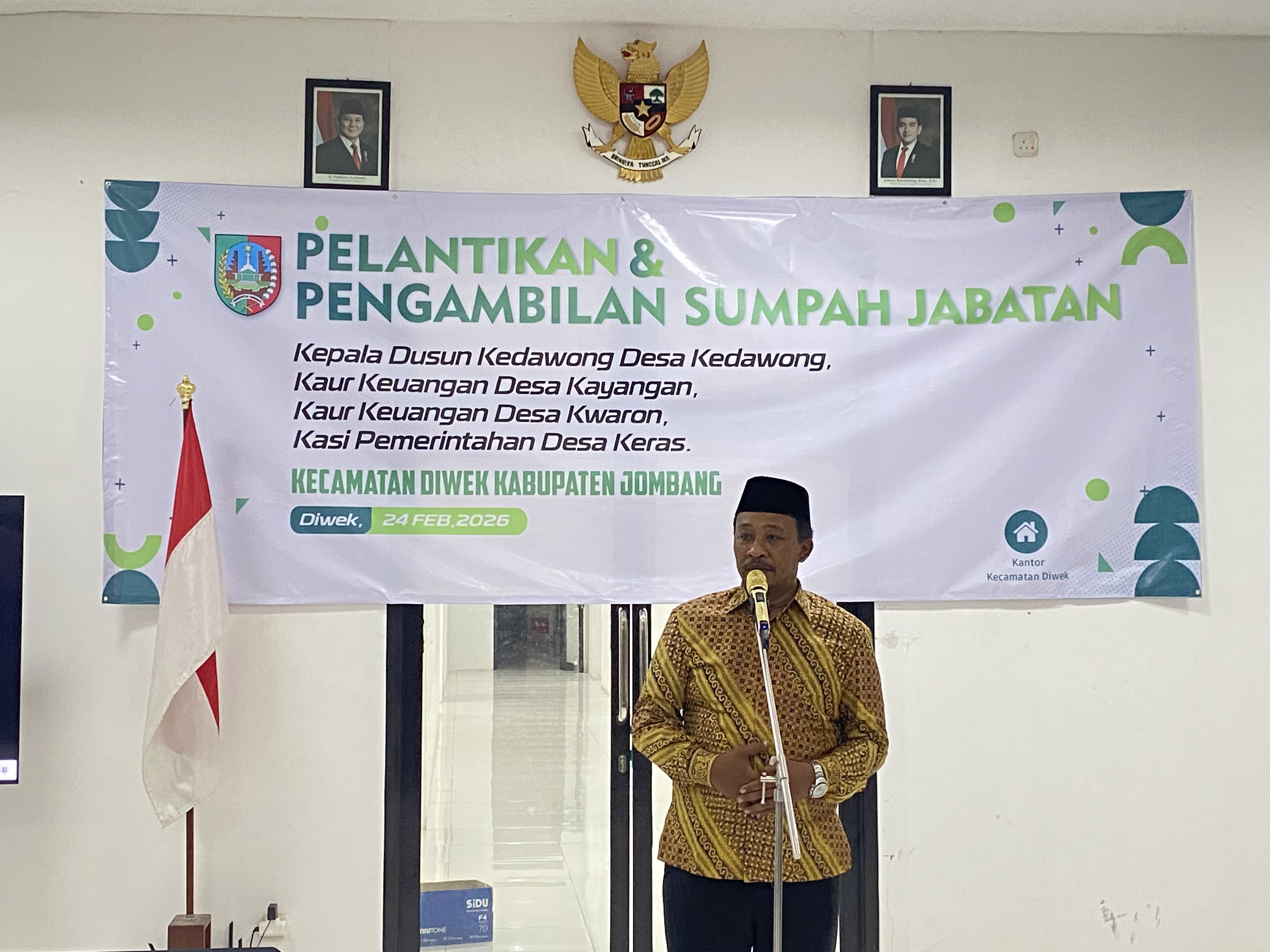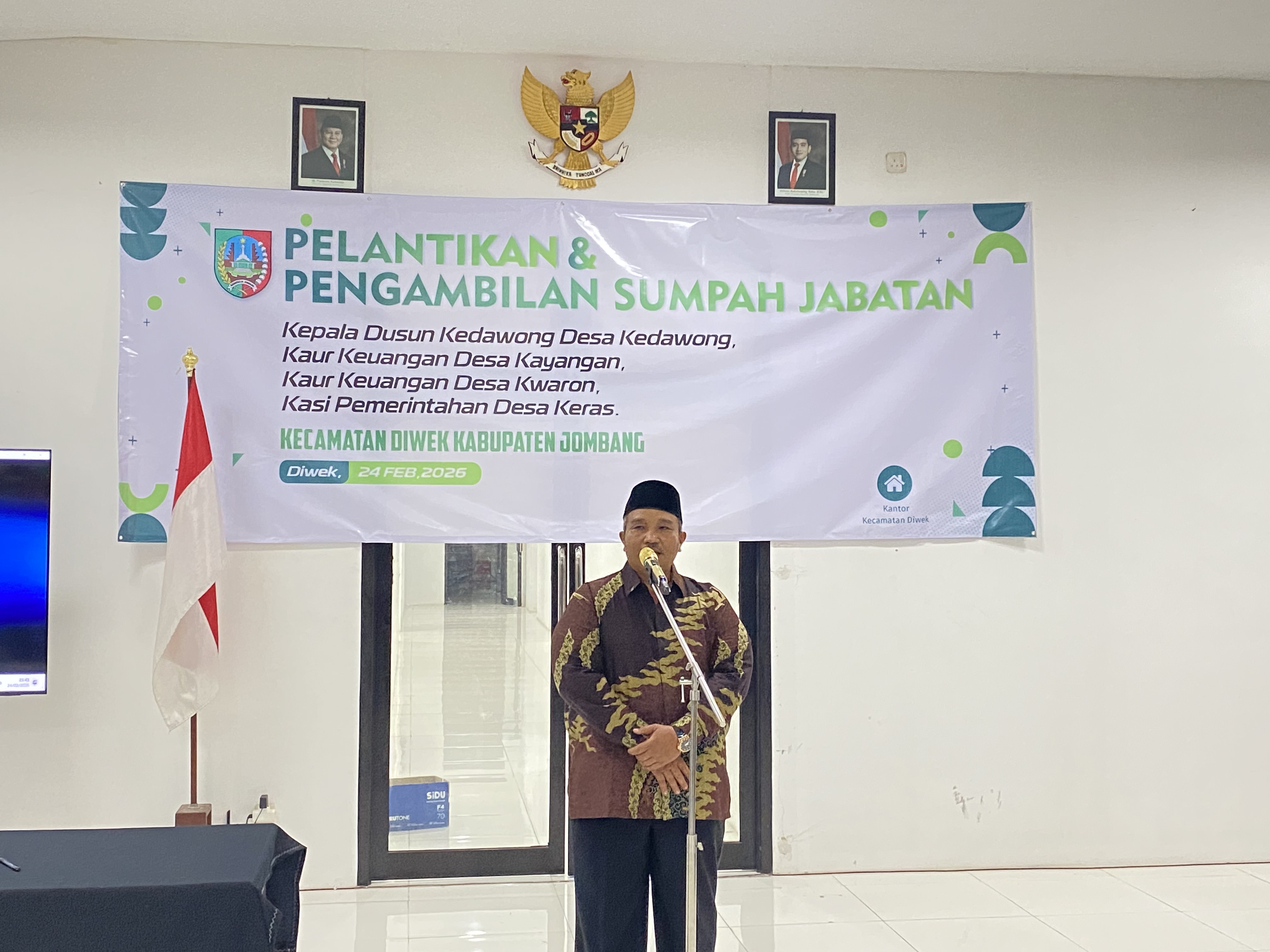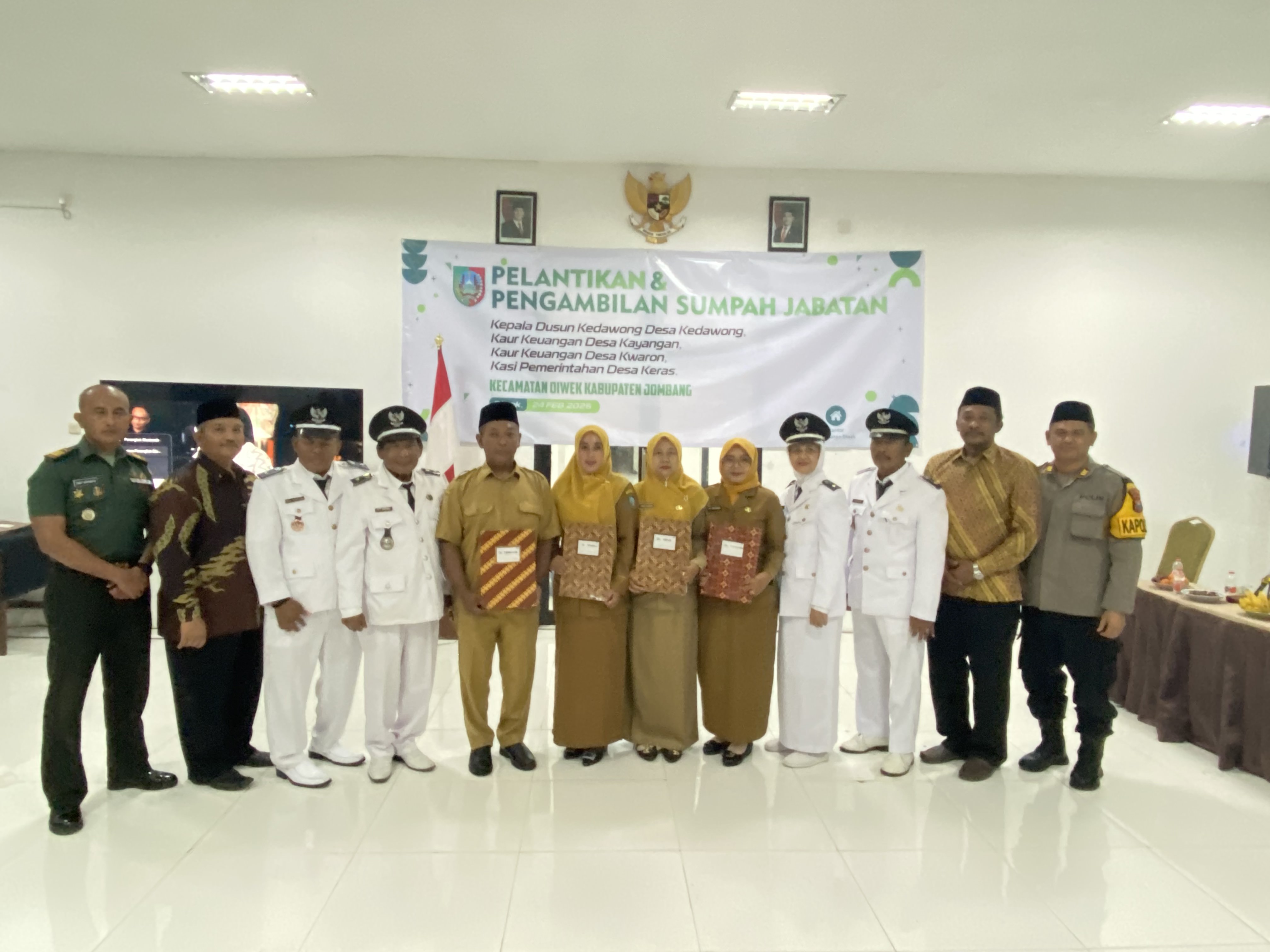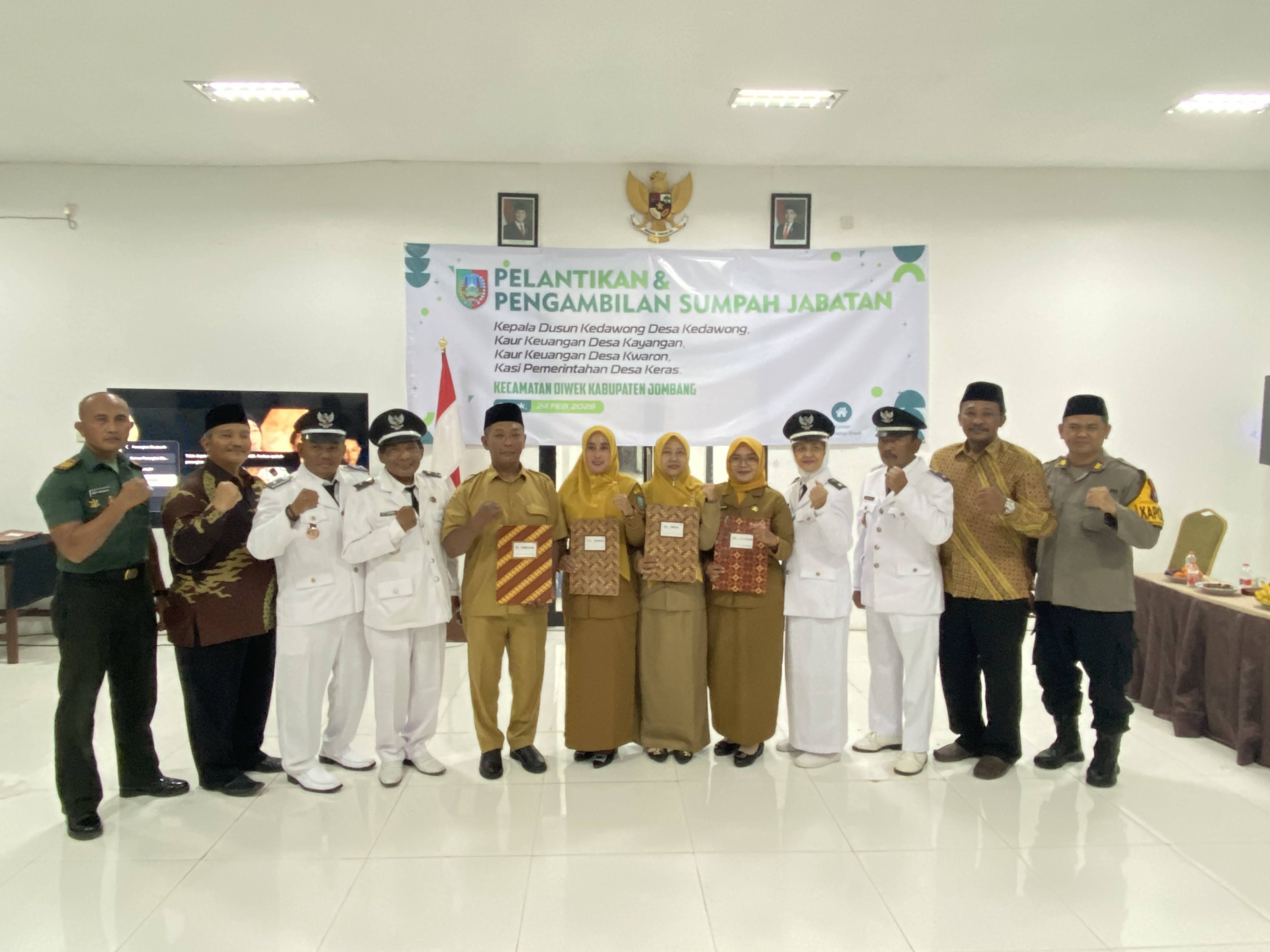 Sebanyak empat perangkat desa resmi dilantik dan diambil sumpah jabatannya dalam sebuah prosesi khidmat yang digelar di Aula Kecamatan Diwek pada Selasa, 24 Februari 2026. Keempat perangkat desa tersebut berasal dari Desa Keras, Desa Kwaron, Desa Kayangan, dan Desa Kedawong.